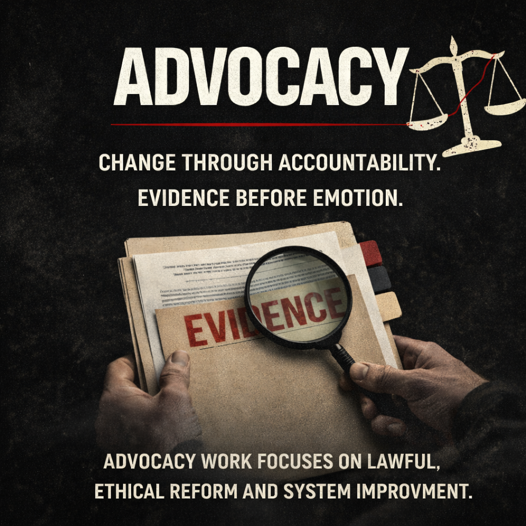 Advocacy work focuses on lawful, ethical reform and system improvement.