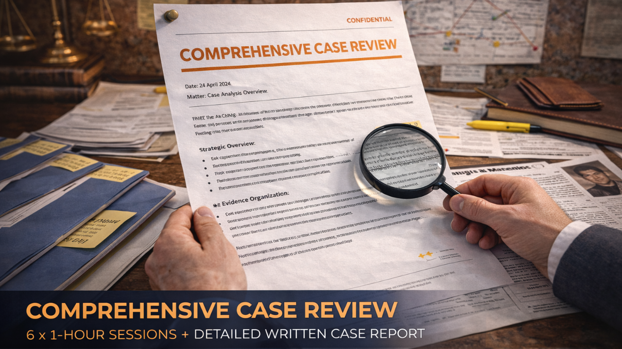 The Comprehensive Case Review is a full deep-dive strategic assessment designed to build a complete structural overview of your matter.